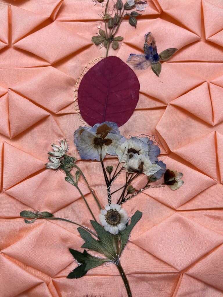 Avec ce projet de décor, je souhaitais recréer un fragment de bord de chemin printanier, un moment contemplatif privilégié, à l’image de la tapisserie L’École Buissonnière de Dom Robert (1997). Les végétaux s’entrelacent et se confondent pour former des arborescences uniques et précieuses, sur un fond de plissage en pongé de soie rose. Les fleurs pressées sont ici rehaussées de broderies à l’aiguille en fils métallisés, qui ajoutent un léger scintillement, invitant à se rapprocher pour mieux plonger dans la scène. Lorsque le cadre est rétroéclairé, le plissage de soie prend le devant de la scène, révélant son secret complexe de fabrication : une superposition invisible et régulière de petits plis, sur lesquels se dessinent en ombres chinoises veinées les feuilles et les pétales de l’herbier.